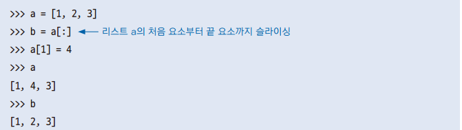 동일한 객체를 가리키는 것이 아니라 내용 자체를 복사해서 새롭게 갖고싶다면 리스트를 슬라이싱해서 b에 할당해준다.