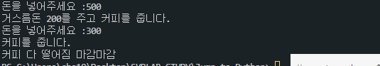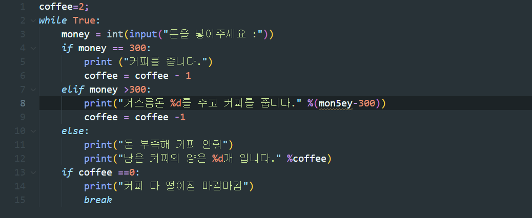 while의 조건문은 계속 true이지만 coffee가 다 떨어져 break 문이 실행된 이후 while문에서 빠져나오게 된다.