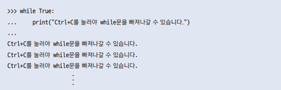 조건문 자체에 True를 넣어두거나 True인 다른 값을 넣어두면 while문 안에 있는 문장들이 무한하게 수행된다.