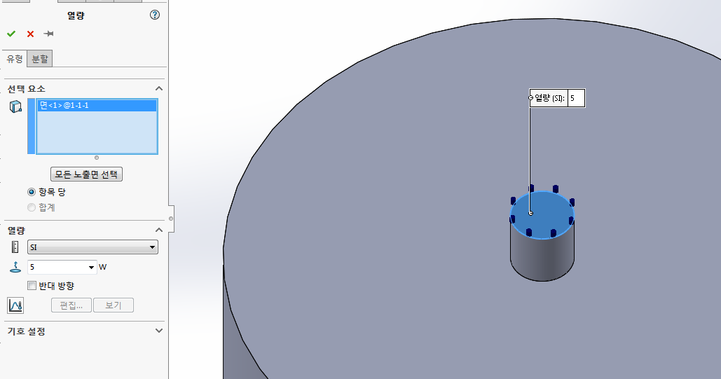 열량을 선택하여 다음과 같이 단추부 윗면을 5W로 설정해준다.