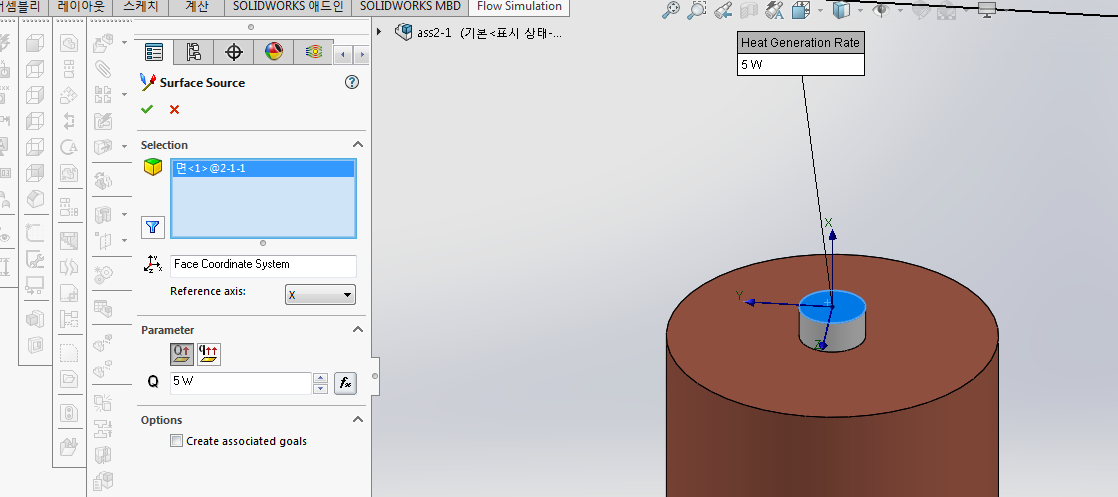 flow simulation features의 surface source에서 발열면을 단추부 윗면으로 선택하여 5W의 열량을 넣어주었다