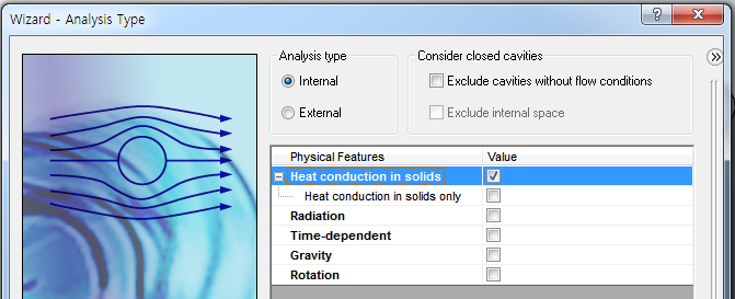 analysis type 설정에서 heat conduction in solids를 체크해준다.