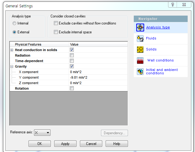 flow simulation의 general setting에서 중력을 추가해주었다.