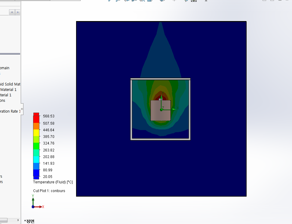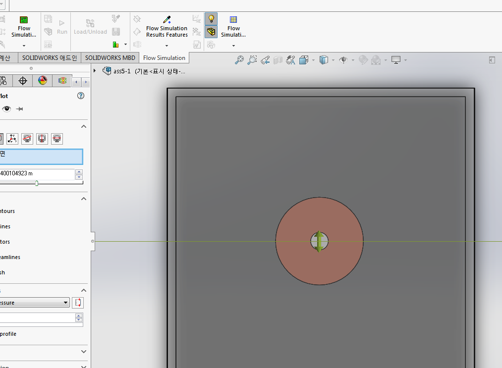run 하고 flow simulation results features에서 cut plot을 solid중앙부에 두고 결과를 확인한다.