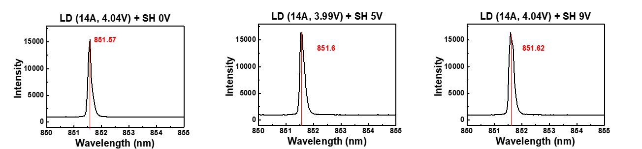 고출력 Laser Diode의 선폭 안정화를 위하여 설치한 Space Heater에 0~9V를 인가하였을 때,