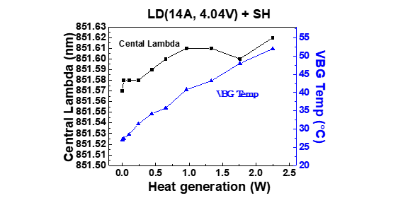 VBG 1'C당 중심파장이 약 2pm/'C 이동하였다. 스팩상 1'C 당 8.5pm가 이동해야하는데 절반도 못 미치는 결과가 나왔다.