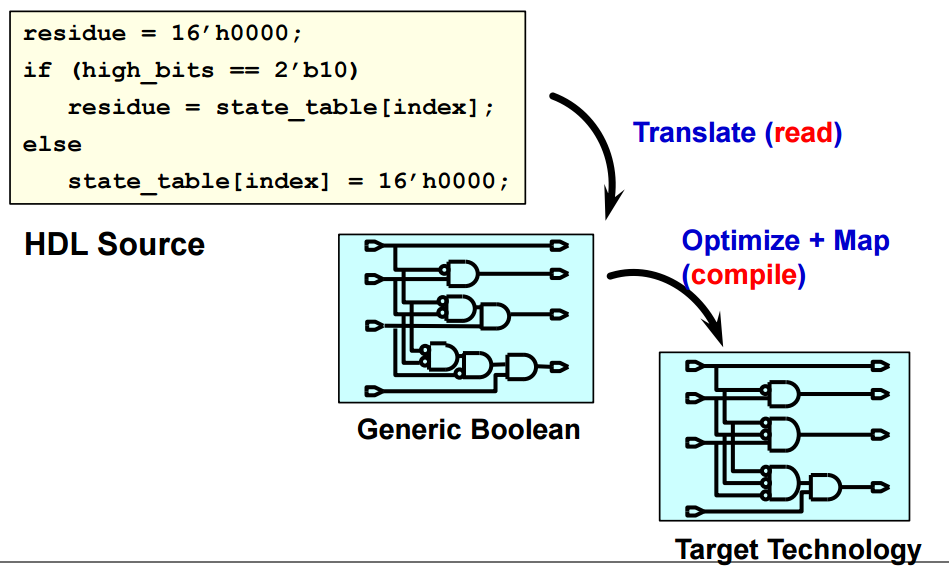 Synthesis는 Verilog로 쓰인 HDL source를 Translate하여 Gate level로 바꾸어준다.(Generic Boolean...일반화?)