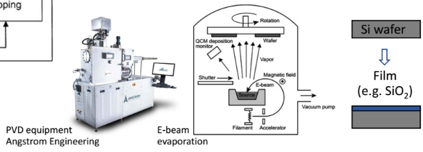 metal vapor deposition process PVD equipment Angstrom Engineering : Si wafer에 metal을 올릴 수 있는 장비 E-beam evaporatoin : 녹은 metal 의 진공에서의 직진운동 이용