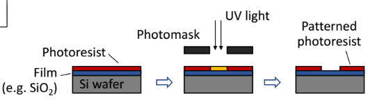 Photoresist는 본래 엉켜 있는 구조에서 빛을 받게되면 파스타면이 풀어지듯 풀어지고 이를 developer에 담구면 위와 같이 빈공간이 되며 사라진다. 이러한 특징을 활용하여 Photomask가 없는 부분에 UV light이 들어가면 photoresist가 UV light에 노출되며 Wafer에 pattern이 생성되는 것이다.