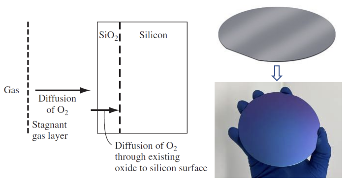 [3]Thermal Oxidation (열 산화) An excellent native oxide SiO2 layer(300nm) can be formed on the surface of Si wafer. 아래 사진과 같이, Silicon wafer에 산화막을 형성하면 푸른빛을 띄게 된다. Schemtaic of the oxidation process Silicon에 산화막(SiO2)를 만드는 방법은 2가지가 있다. - Silicon에 gas 주입 : Si + O2 -> SiO2 - wet (물로 적시기) -> Si +H20 -> SiO2 + 2H2 // 수소 gas 발생