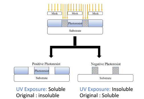 [ Type of Photolithography ] : Positive and Negative Positive Phtoresist는 빛이 들어가는 부분을 없애고, Negative Photoresist는 빛이 들어가는 부분이 단단해진다.