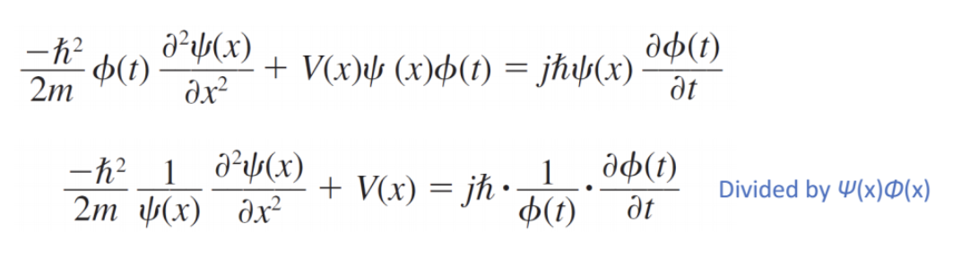 여기까지 정리를 한 뒤, 이 식에서 Ψ(x,t) = Ψ(x)φ(t)로 바꾸어준다.