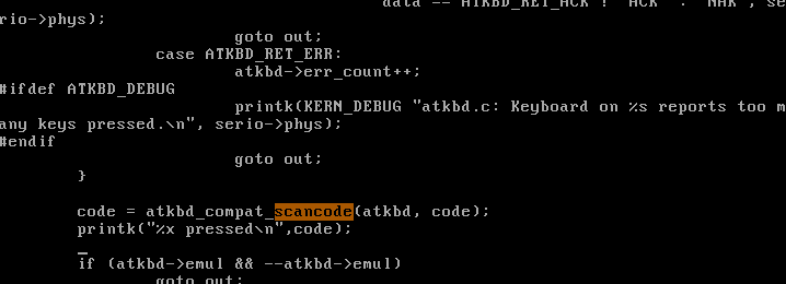 scancode의 인자로 받는 code의 값을 print하도록 printk("%x pressed\n", code);를 추가하여
