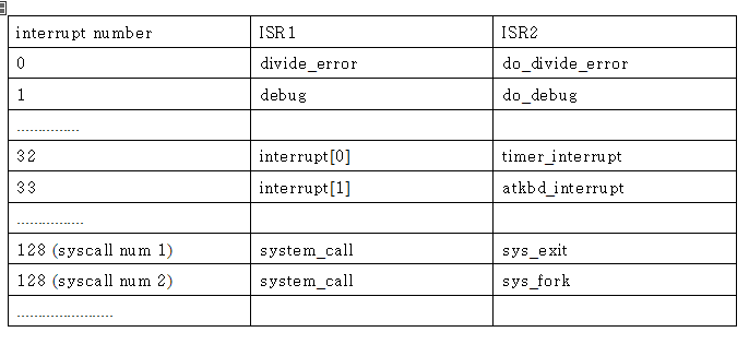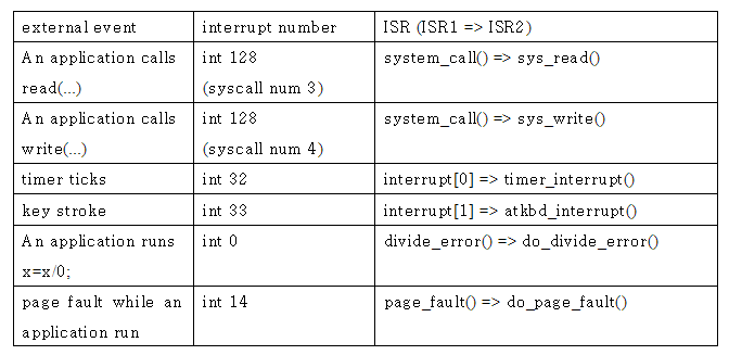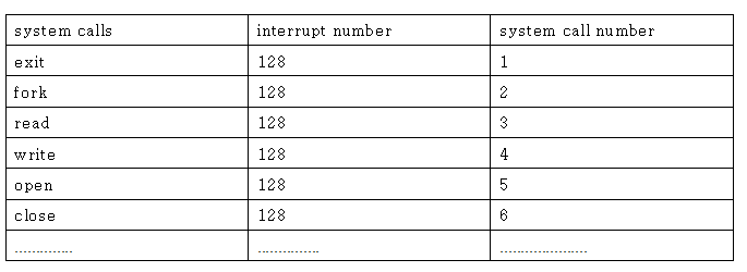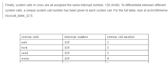 Finally, system calls in Linux are all assigned the same interrupt number, 128 (0x80). To differentiate between different system calls, a unique system call number has been given to each system call. For the full table, look at arch/x86/kernel/syscall_table_32.S.