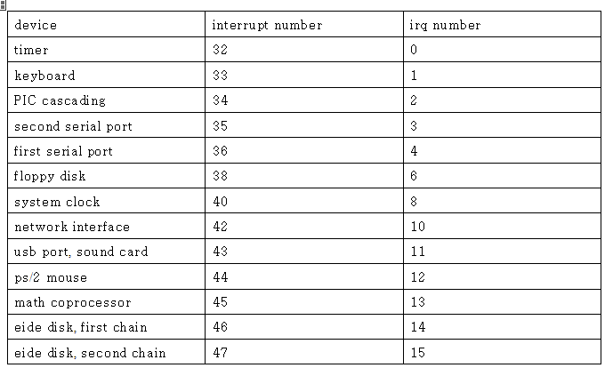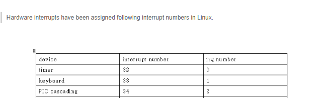 Hardware interrupts have been assigned following interrupt numbers in Linux.