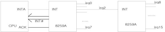 'hit a key'의 interrupt가 발생되면 8259A의 1번 단자(IRQ1)에 연결된 keyboard controller가 interrupt signals를 보낸다.