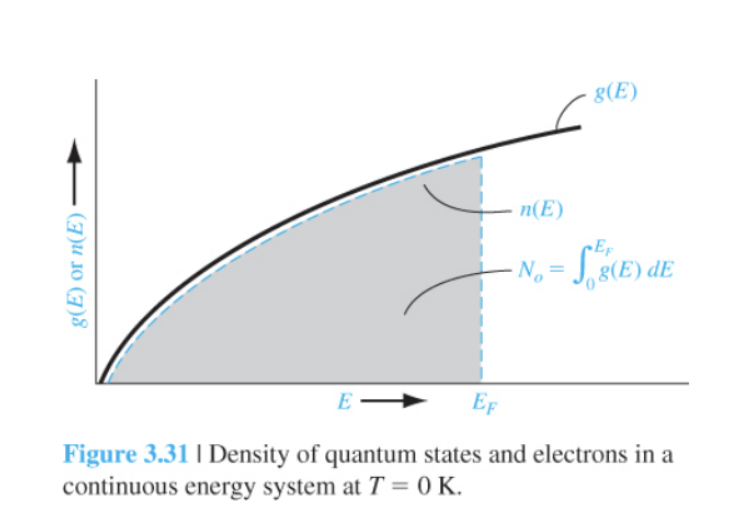 EF Fermi Energy //임의의 에너지에서 채워진 total quantum states의 비율 N(E) (에너지당) 부피당 입자 수 g(E) (에너지당) 부피당 quantum states //DoS