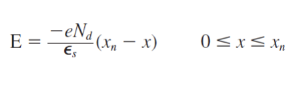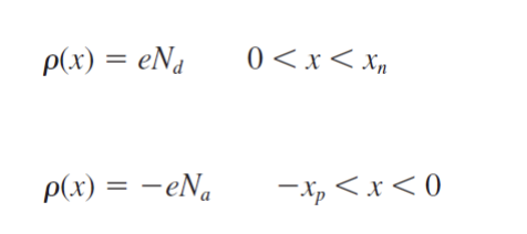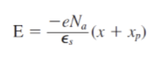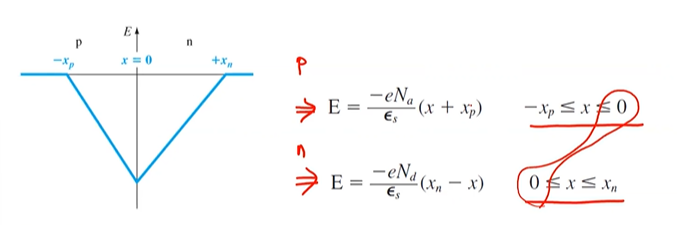 각 영역에서의 E-field식은 다음과 같으며, 두 식에서 x=0 (접합면)에서의 값은 연속성에 의해서 같아야한다.