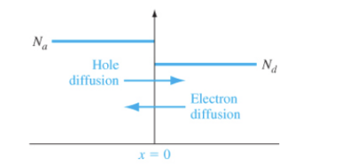 Doping profile of an ideal uniformly doped pn junction 위 그림에서 확인할 수 있듯이, hole의 농도는 p type에서 Na만큼의 값을 일정하게 가지다가 x=0을 기점으로 0이되고 electron의 농도 역시 Nd만큼 일정하게 가지다가 x=0을 기점으로 0이 된다.