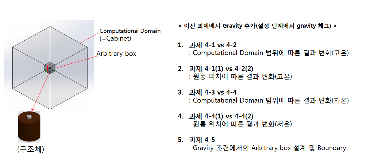 신입 연구원 대상 입문 과제 Forced Conviction Forced Conviction 5-1 과제3에서의 Arbitrary box 와 동일한 환경에서 box의 재질만 ABS(플라스틱)으로 변경하였다. -> flow simulation이 실행되지 않았다. 1.Wizard 설정 다시하기-> 재질, 열량 ,온도 설정 초기화 2. 중력 인가하기 3. run 이래도 안돼서 메이트부터 다시 했다~! 아무래도 메이트가 잘 안 되었던 것 같다!! 메이트를 다시 하고 기본 세팅을 마쳤다.(Wizard, 중력 인가, 재질 설정, 열량 설정) run 하고 flow simulation results features에서 cut plot을 solid중앙부에 두고 결과를 확인한다. Temperature Temperature..